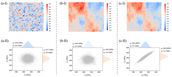 Figure 9 illustrates the dual-correlation sampling process for the macroscopic tensile specimen. Specifically, Figure 9a presents the samples of Xt obtained through the completely independent sampling method, Figure 9b displays the samples via a single application of the spatial autocorrelation sampling method, and Figure 9c exhibits the samples derived from the dual-correlation sampling method. The series of subplots (I) presents the distribution contour patterns of Xt assigned to the random regions of SFEMs, and the series of subplots (II) depicts the data scatter plots and marginal distribution plots between Xt and Xc.