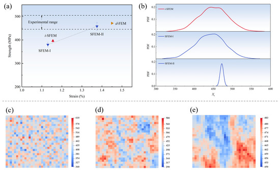 Additionally, it is observed that the error bars for structural strength predicted by the dual-correlation sampling method are significantly higher than those from the i-SFEM. Moreover, the corresponding error bars enlarge with the intensification of the degree of spatial autocorrelation. This is attributable to the fact that although the probability distribution of samples obtained by the i-SFEM exhibits the broadest range, the samples tend to approximate the statistical probability distribution of material parameters. The minimum values that determine structural performance in weak regions remain highly similar, resulting in prediction deviations not exceeding 6.5 MPa. It also demonstrates the insufficient capability of the independent sampling method in effectively reflecting the discreteness of structural strength performance. In contrast, samples considering spatial autocorrelation are influenced by initially randomly generated seeds, leading to pronounced fluctuations in both mean value and standard deviation, as illustrated in Figure 10d,e. Consequently, the predicted values exhibit remarkable randomness while remaining within the experimental deviation range. Specifically, the standard deviation of 17.0 MPa predicted by SFEM-II closely aligns with the experimental value of 21.3 MPa, which further corroborates the validity of the stochastic model.