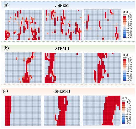 Comparison of typical damage contour maps for tensile specimens predicted by three SFEMs: (a) i-SFEM; (b) SFEM-I; (c) SFEM-II.