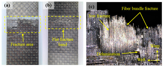 The comparison of in-plane tensile stress–strain curves obtained from the experiment and RVE model is represented in Figure 6a. The curve predicted by the RVE model falls within the range of the experimental curves. Furthermore, Figure 6b illustrates the warp-direction damage state of plain woven composites at the peak load. As the warp fiber bundles serve as the primary loading-bearing components under in-plane tensile loading, it can be observed that the damage predominantly occurs in the interlacing regions of fiber bundles, ultimately leading to the formation of a fracture band nearly perpendicular to the load direction. For comparison, Figure 6c,d presents the fracture damage morphology of a typical composite specimen by SEM observation. Various damage forms are observed via SEM, including the fracture and splitting of warp and weft fiber bundles, as well as interlaminar and intralaminar delamination due to the misalignment and nesting phenomenon. However, there is a fracture band at the edge of the weft fiber bundles, where the entire warp fiber bundles have fractured. The observation is consistent with the prediction of the RVE model, indicating that the RVE model can predict the damage characteristics of plain woven composites.