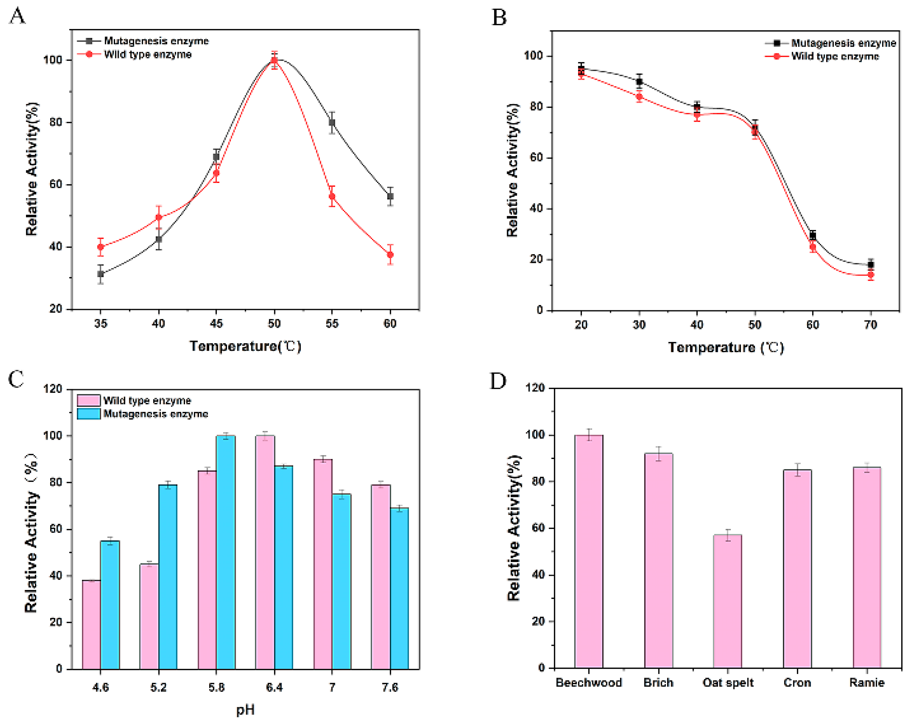2.2.5. Temperature and Optimal pH of Mutant Xyn-ep