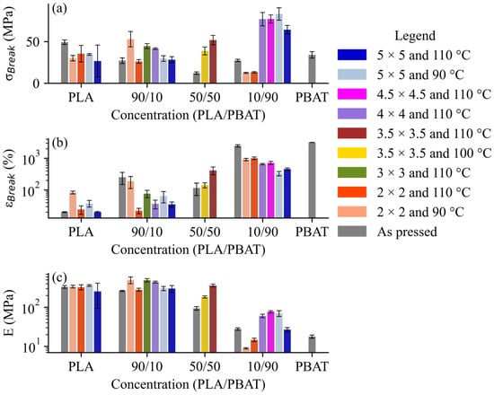 Mechanical testing was performed on an MTS Criterion Model 43 (MTS Systems Corporation, Eden Prairie, MN, USA) fitted with coarse sand-blasted grips or an Instron® 5967 (Instron®, Norwood, MA, USA) fitted with tapered grips. ASTM Standard D 638-22 Type V dog-bones were cut with ASTM-certified cutting dies (Fremont Cutting Dies, Inc., Fremont, OH, USA). The εBreak, σBreak, and elastic modulus (E) were characterized fivefold for each sample from the engineering stress–strain curves obtained at a 50 mm·min−1 testing speed and room temperature. There was no designation of MD or TD for the hot melt-pressed (not stretched) control samples because the technique is isotropic, but the samples were cut along the same direction for all the replicates. All the stretched samples were characterized in the MD only. The εBreak and σBreak were statistically analyzed using analysis of variance (ANOVA), polynomial regression, and Tukey’s Honestly Significant Difference (HSD) test for pairwise mean comparisons with 95% confidence (see Supporting Information).