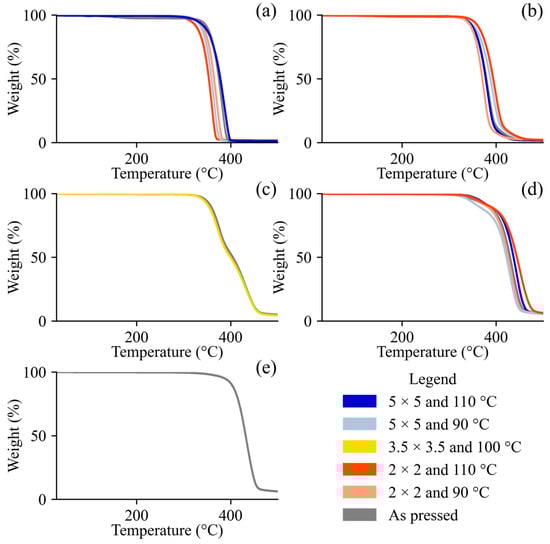 TGA thermograms of DoE runs (1 D, 2 D, 3 D, 4 D, 5 D, 6 D, 7 D, 8 D and 9 D) and control runs (10 C, 11 C, 12 C, 13 C, 14 C, 15 C, 16 C, 17 C, and 18 C) organized by composition: (a) pure PLA, (b) 90%/10% PLA/PBAT, (c) 50%/50% PLA/PBAT, (d) 10%/90% PLA/PBAT, and (e) pure PBAT.