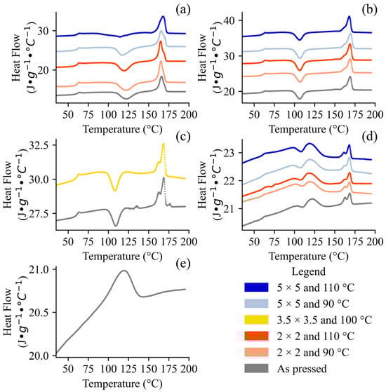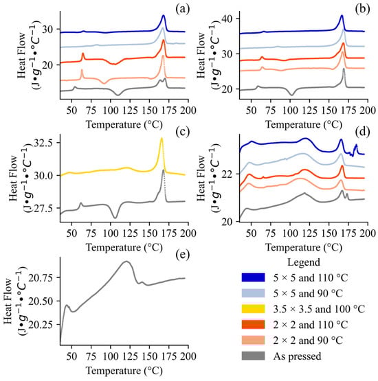 where ΔHm is the measured heat of fusion of the blend, ΔHcc is the measured cold crystallization peak during heating, m is the mass fraction of the polymer of interest in the blend (if applicable), and is the standard heat of fusion for a pure infinitely thick crystalline form [45]. The value of 107 J·g−1, published by Righetti et al., 2015 [46], was selected as the of PLA in our work due to evidence of α’ crystals [46,47]. The ΔHcc was set to zero when absent or indistinguishable from other peaks. The glass transition temperature (Tg) was identified as the inflection point between the change in heat capacities circa 62 °C for each sample using built-in software.