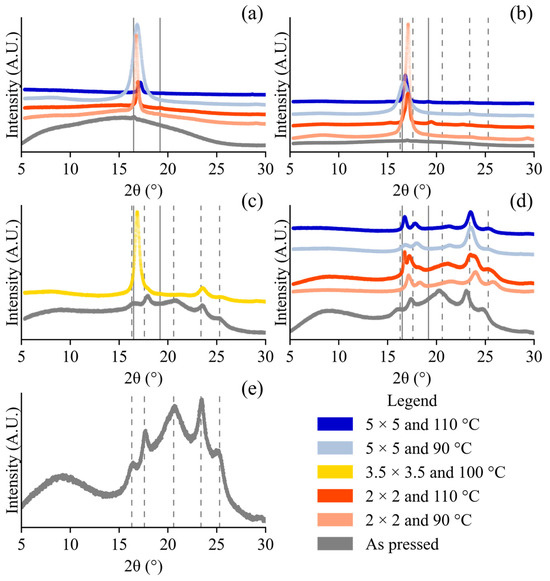 XRD traces for DoE runs (1 D, 2 D, 3 D, 4 D, 5 D, 6 D, 7 D, 8 D, and 9 D) and control runs (10 C, 11 C, 12 C, 13 C, 14 C, 15 C, 16 C, 17 C, and 18 C) organized by composition: (a) pure PLA, (b) 90%/10% PLA/PBAT, (c) 50%/50% PLA/PBAT, (d) 10%/90% PLA/PBAT, and (e) pure PBAT. Solid lines represent phases attributed to as-pressed PLA (2θ 16.5°, 19.2°), while dashed lines represent phases for as-pressed PBAT (2θ 16.3°, 17.6°, 20.6°, 23.4°, 25.3°).