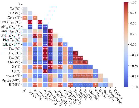 A Pearson correlation matrix was depicted as a heat map (Figure 6) and used as a preliminary assessment of multicollinearity. The heatmap is a representation of the correlation coefficient between each pair of features (see Supporting Information). The PLA concentration yielded the most significant correlations out of all the input parameters. PLA correlated strongly with the ΔHm (+0.99), char yield (−0.98), T50 (−0.94), T85 (−0.87), ΔHr (+0.85), E (+0.81), T90 (−0.79), X (+0.78), εBreak (−0.74), ΧPLA (+0.65), and PLA Tg (−0.50) (Figure 6). The ΔHm correlated strongly with PLA because of the greater PLA concentrations in the blends, yielding a stronger signal. The decomposition correlations (char yield, T50, T85, and T90) are in agreement with those of others [58]. The PLA concentration was slightly correlated with the D (−0.45), σBreak (−0.26), and Tm (+0.24) (Figure 6). The λ correlated strongly with fewer parameters than PLA, but more than the Td. The λ was strongly correlated with the ΧPLA (+0.60) and PLA Tg (+0.51). The λ correlated weakly with the ΔHr (−0.49), σBreak (+0.42), εBreak (−0.39), X (+0.34), D (+0.21), E (−0.13), T90 (−0.12), char yield (−0.12), Tm (−0.11), T85 (−0.047), T85 (−0.012), and ΔHm (−0.0029). The Td was strongly correlated with only the X (−0.51). The Td was correlated with the Tcc (+1) and ΔHcc (−1), because very few samples exhibited cold crystallization in the first heating scan (Figure 3), yielding an artificially strong correlation. The Td correlated weakly with the T90 (+0.47), D (+0.40), T85 (+0.39), T50 (+0.33), ΔHr (−0.33), σBreak (−0.31), E (−0.29), ΧPLA (−0.27), ΔHm (−0.20), εBreak (+0.19), Tm (−0.12), char yield (+0.10), and PLA Tg (−0.072) (Figure 6). Overall, our results suggest that the PLA concentration was more effective than the processing conditions (λ and Td) for controlling the film’s mechanical properties (Figure 6). Other than the processing conditions and responses, the T85 and char yield were strongly correlated (Figure 6): the samples exhibiting delayed decomposition also showed higher chars (Figure 2). Our results are consistent with those of other studies [58,63,80]. Any correlations with cold crystallization phenomena (Tcc and ΔHcc) were artificially perfect due to the very limited dataset of samples exhibiting cold crystallization in their first heating scan.