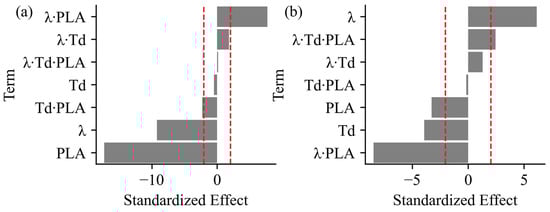 Minitab® Pareto Chart of the standardized effects of terms and their interactions. Only DoE runs are included—namely, 1 D, 2 D, 3 D, 4 D, 5 D, 6 D, 7 D, 8 D, and 9 D. The red dashed line at ±2.037 is the point at which the standardized effects are considered significant, assuming 95% confidence. The standardized effects are for the responses (a) εBreak and (b) σBreak.