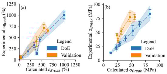 A dataset was obtained to validate the robustness of the model’s predictions (Figure 7). The predictive power of the model developed represented the εBreak and σBreak well, as evidenced by the high R2 values for both the training (DoE) and validation datasets (Figure 8).