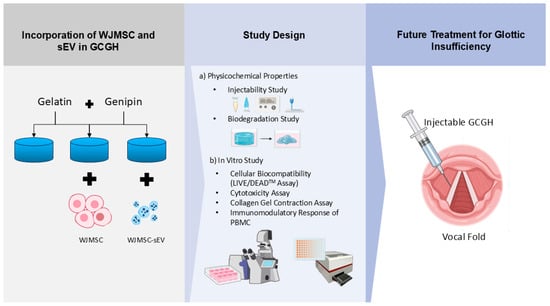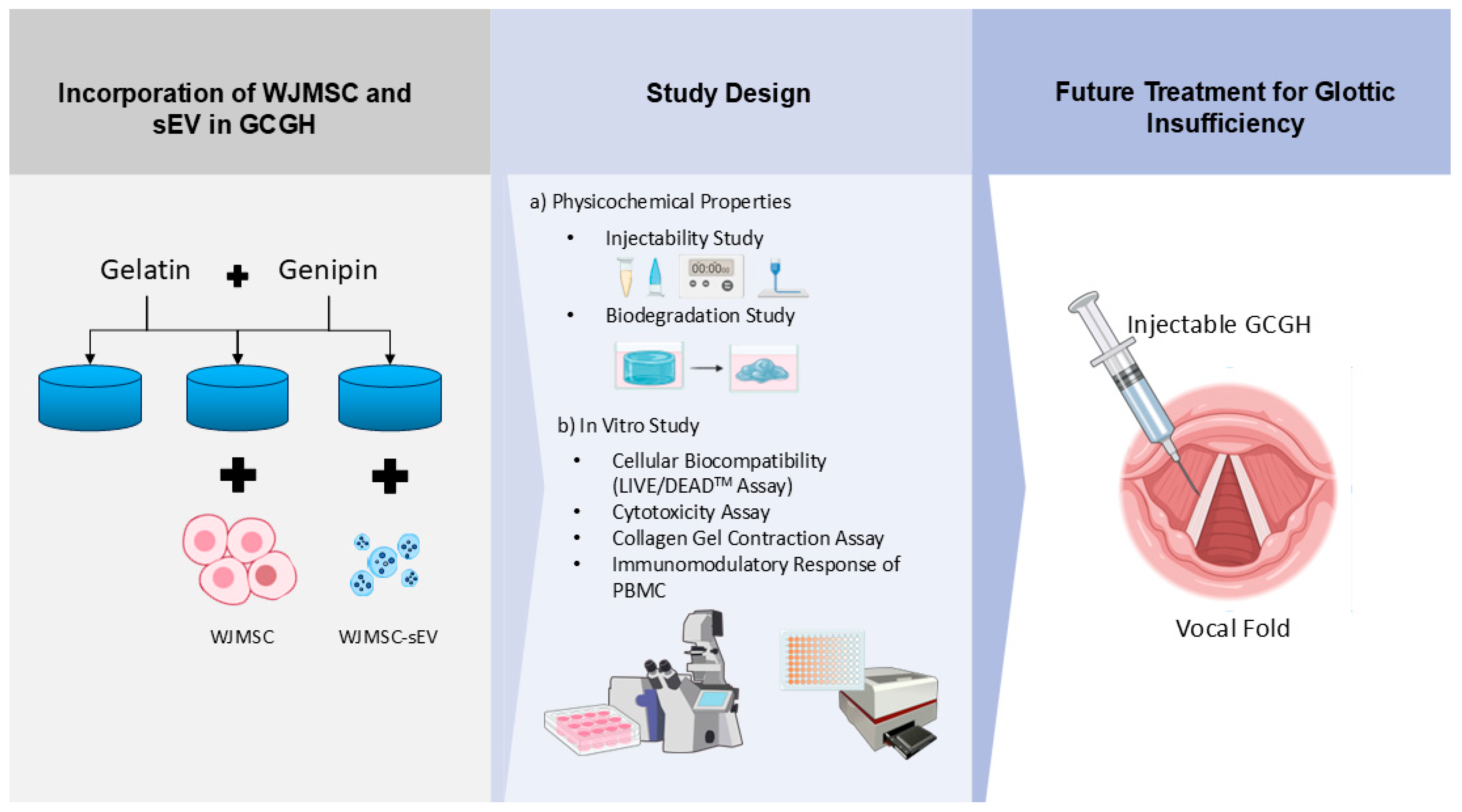 Zamlus, Z.I.; Azman, M.; Lokanathan, Y.; Fauzi, M.B.; Baki, M.M. Effects of Wharton’s Jelly Mesenchymal Stem Cells and Its-Derived Small Extracellular Vesicles Loaded into Injectable Genipin-Crosslinked Gelatin Hydrogel on Vocal Fold Fibroblast. Polymers 2025, 17, 2653. https://doi.org/10.3390/polym17192653