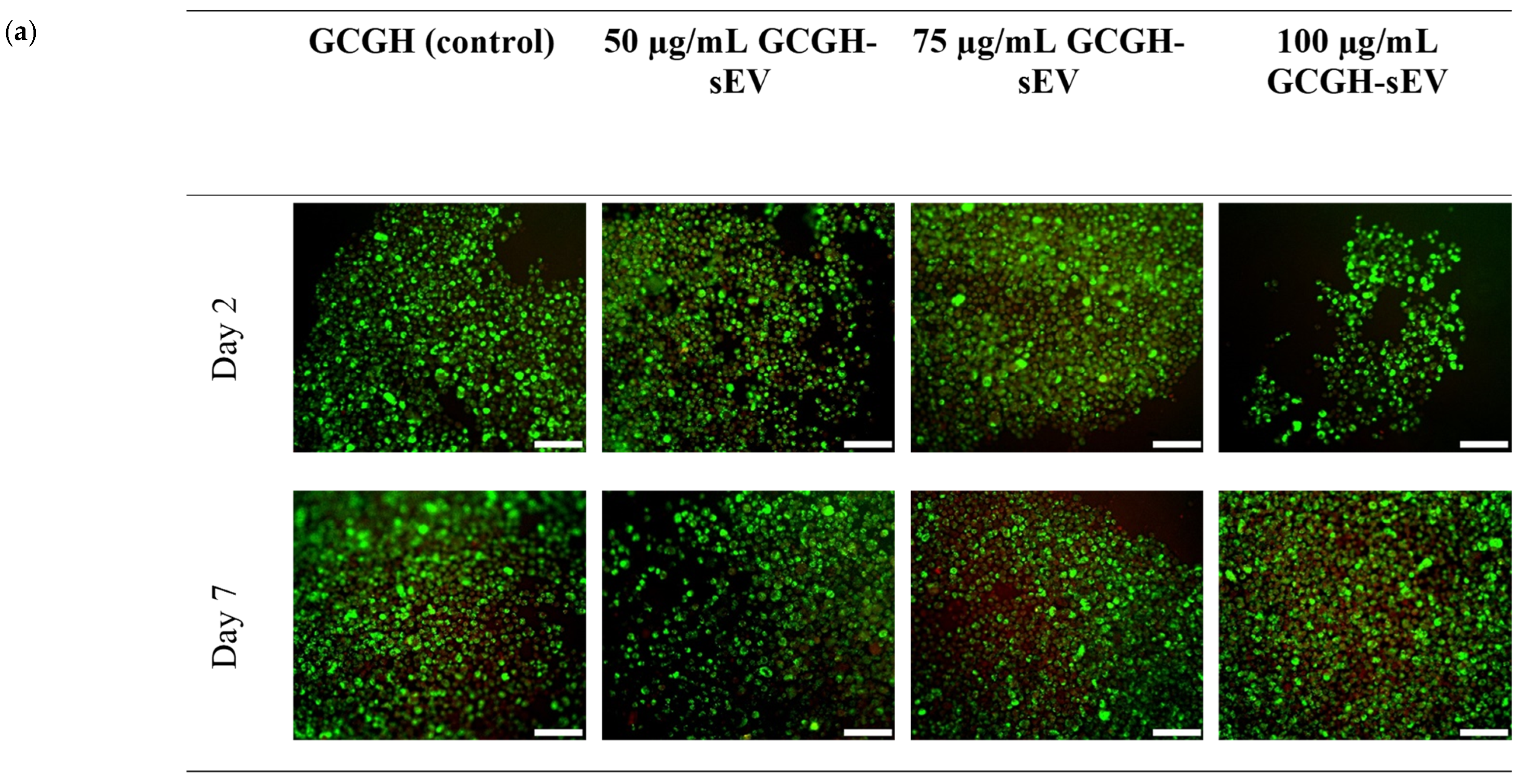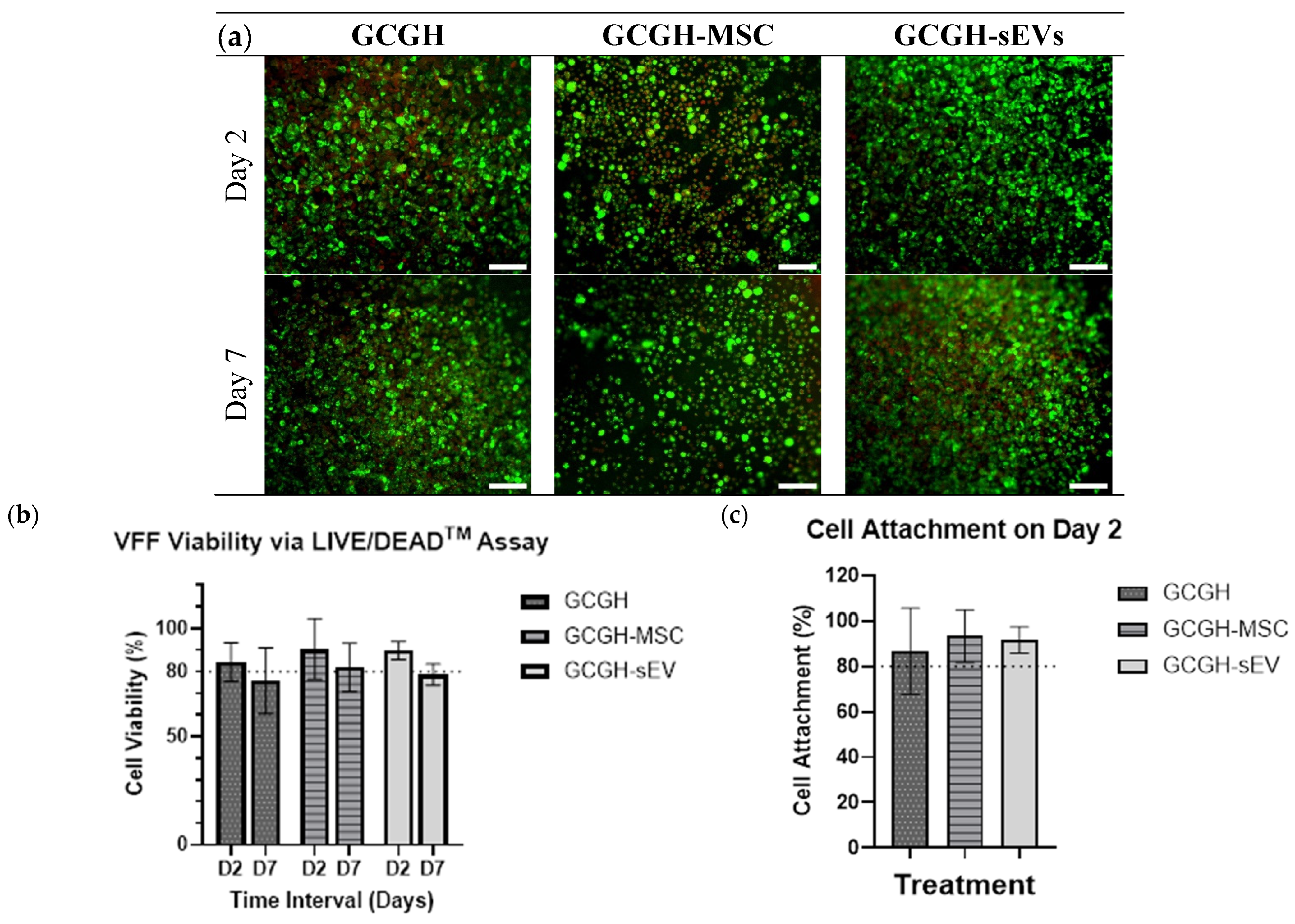 2.4.3. Biocompatibility of VFFs with GCGH-sEVs via LIVE/DEADTM Assay