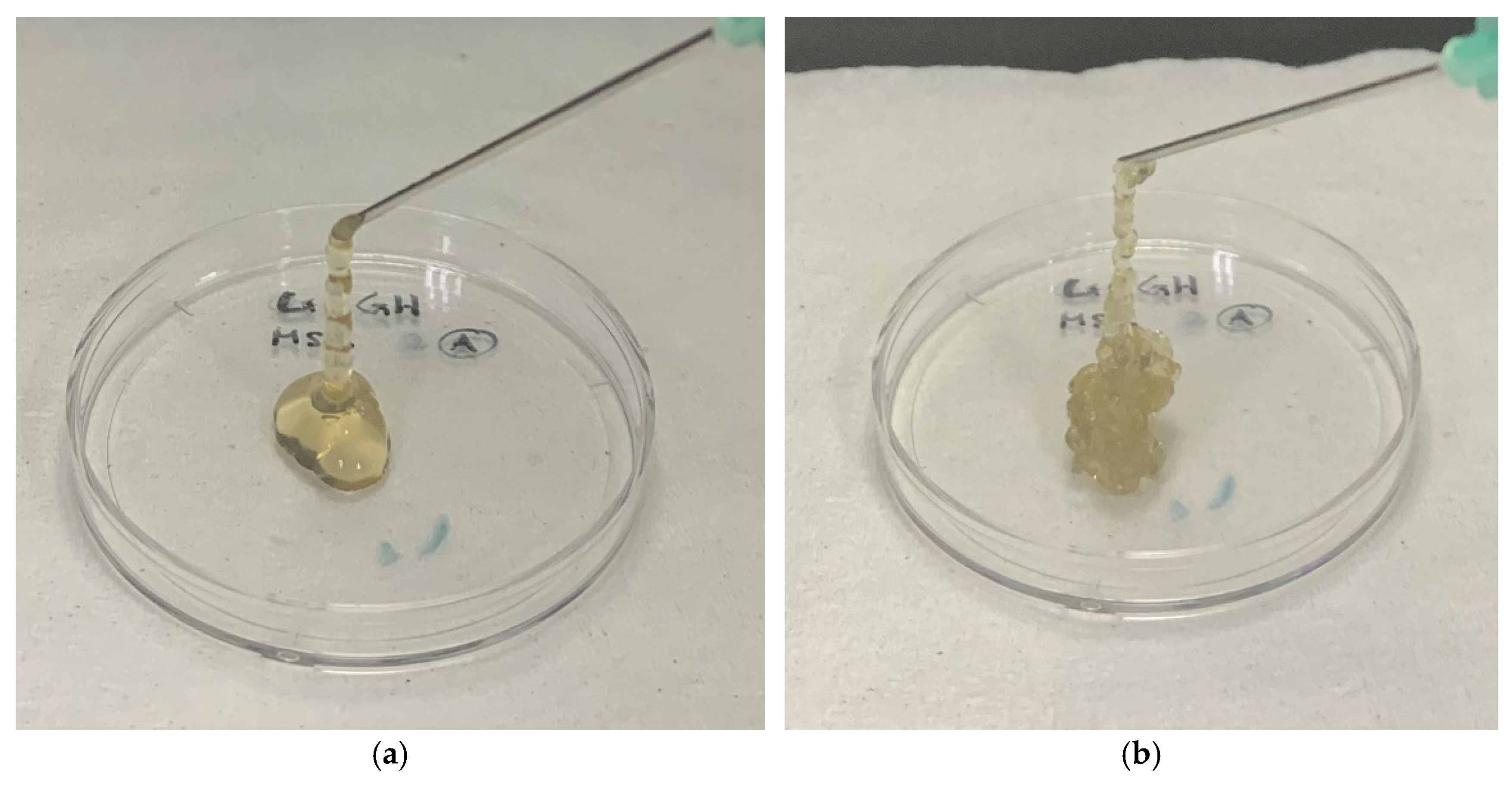 - Chen, M.H.; Wang, L.L.; Chung, J.J.; Kim, Y.-H.; Atluri, P.; Burdick, J.A. Methods To Assess Shear-Thinning Hydrogels for Application As Injectable Biomaterials. ACS Biomater. Sci. Eng. 2017, 3, 3146–3160. [Google Scholar] [CrossRef] [PubMed]