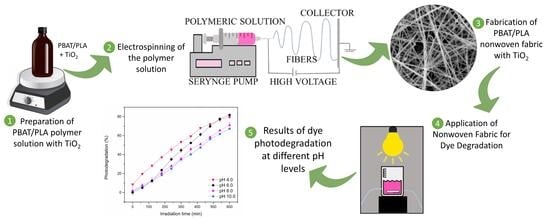 The influence of pH on the photodegradation of Red BF-4B dye using PBAT/PLA/TiO2 electrospun fibers was analyzed (Figure 2).
