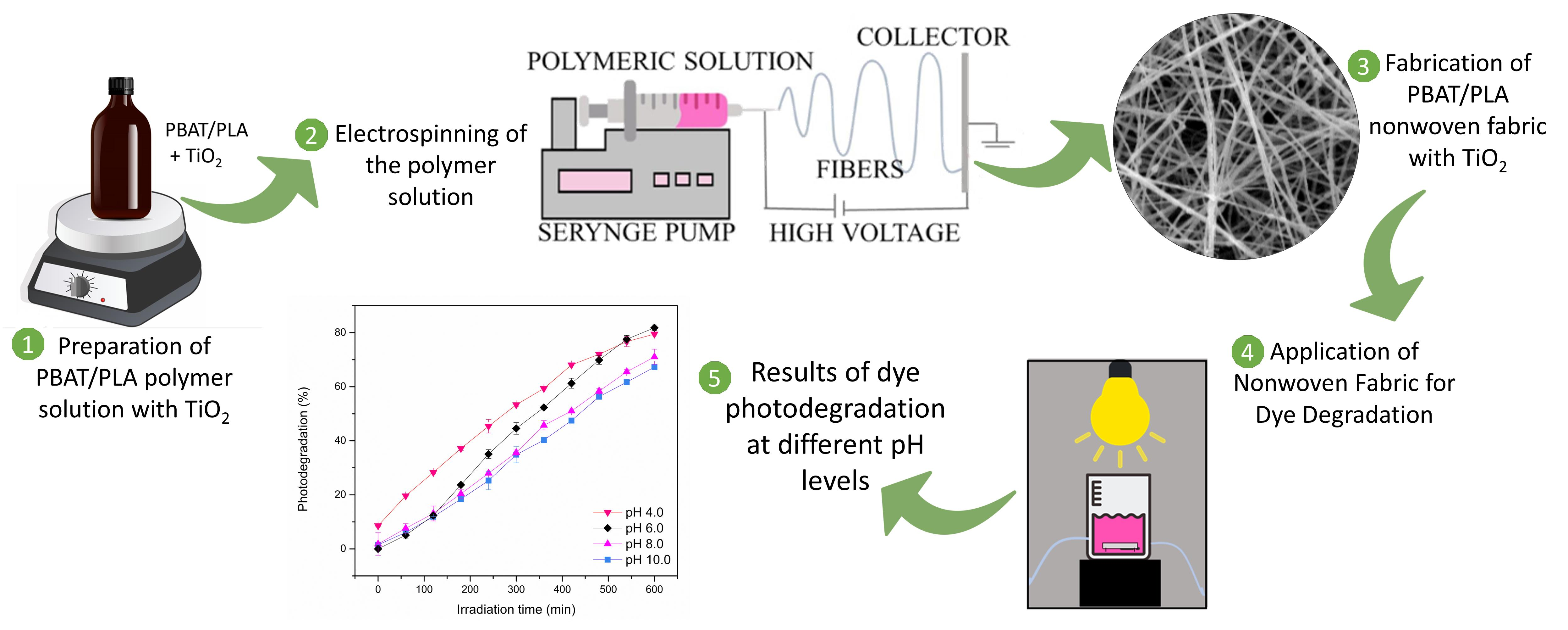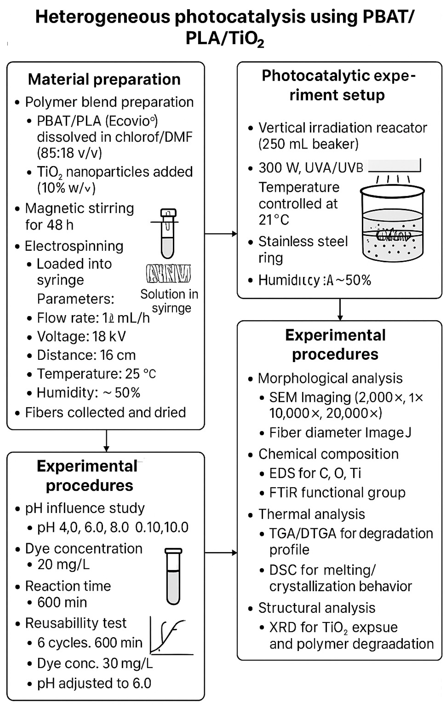 Figure 1. Schematic representation of the heterogeneous photocatalysis process using PBAT/PLA/TiO2 electrospun fibers for the degradation of Red BF-4B dye. The diagram illustrates the complete workflow, including polymer blend preparation, electrospinning, photocatalytic reactor setup, experimental procedures (pH influence, kinetic studies, and reuse cycles), and post-treatment characterization techniques (SEM, EDS, FTIR, TGA, DSC, and XRD).