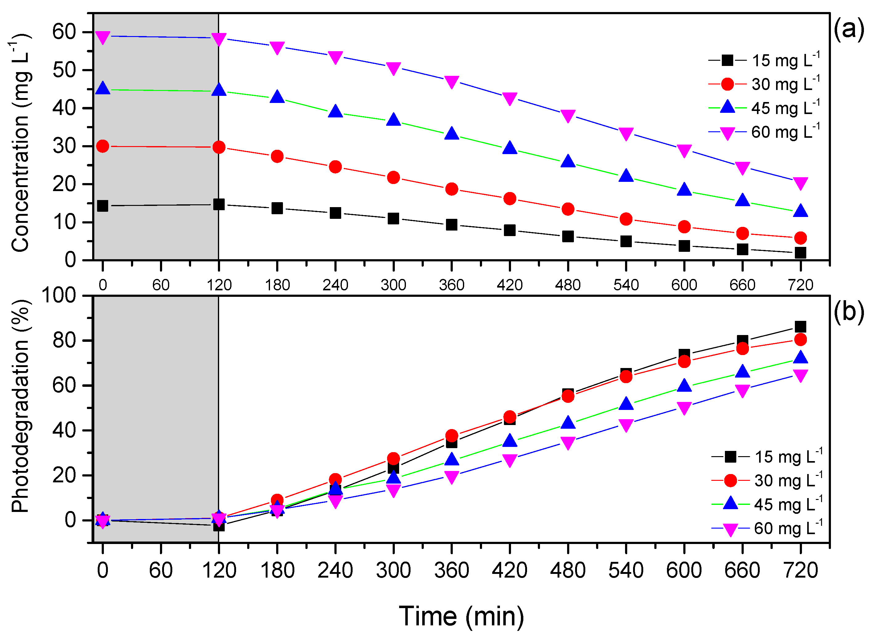 It can be observed in Figure 3b that at the end of the reactions (600 min), the curve for 15 mg L−1 presented the highest percentage of degradation in comparison to the solutions of 30, 45, and 60 mg L−1. However, in all evaluated concentrations, the degradations reached values equal to or greater than 65%.