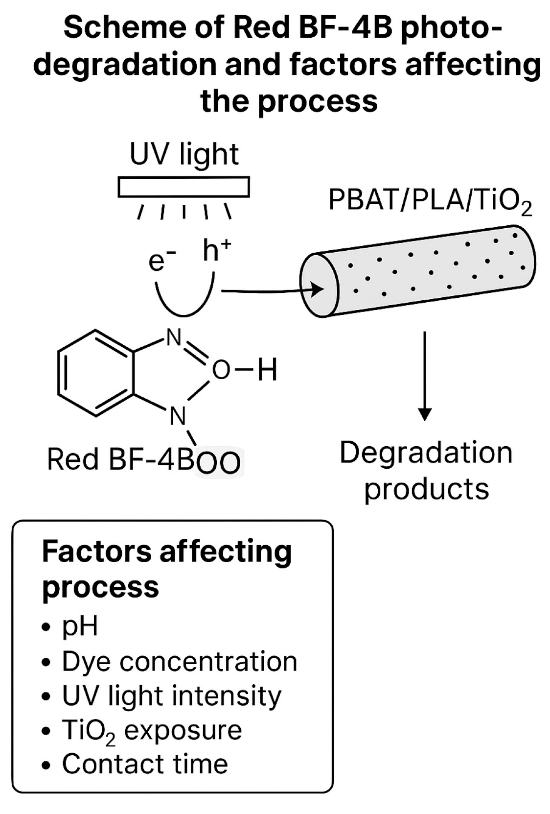 Figure 6. Molecular schematic of the heterogeneous photocatalytic degradation of Red BF-4B dye using PBAT/PLA/TiO2 electrospun fibers. Upon UV irradiation, TiO2 nanoparticles generate electron–hole pairs, leading to the formation of reactive oxygen species such as hydroxyl radicals (•OH). These radicals attack the dye molecules, breaking down their complex azo structures into smaller, non-toxic compounds. The efficiency of this process is influenced by factors including pH, dye concentration, UV light intensity, catalyst exposure, and reaction time.