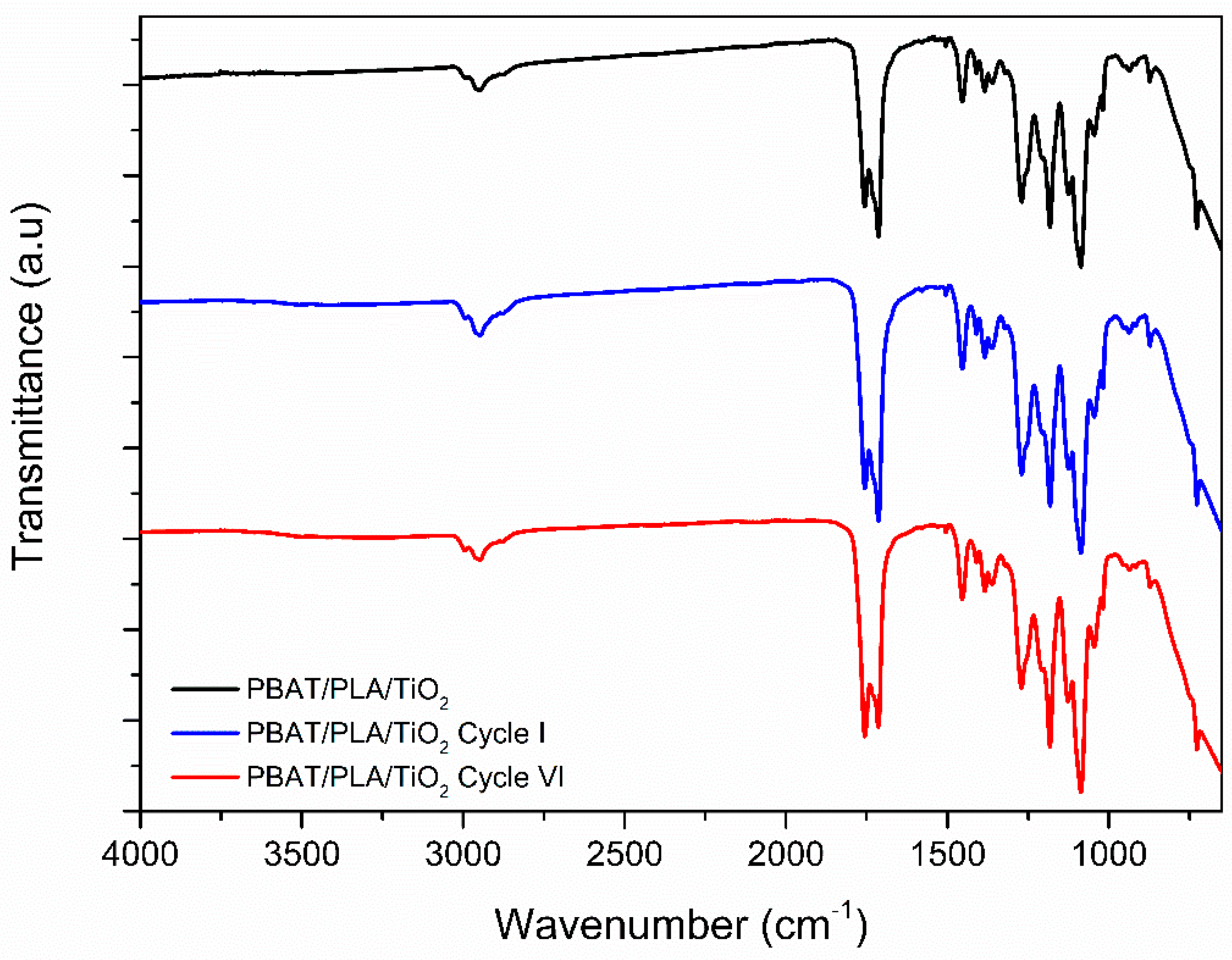 Figure 8. FTIR-ATR vibrational spectra of PBAT/PLA/TiO2 polymeric films after their use in the 1st and 6th photodegradation cycle.