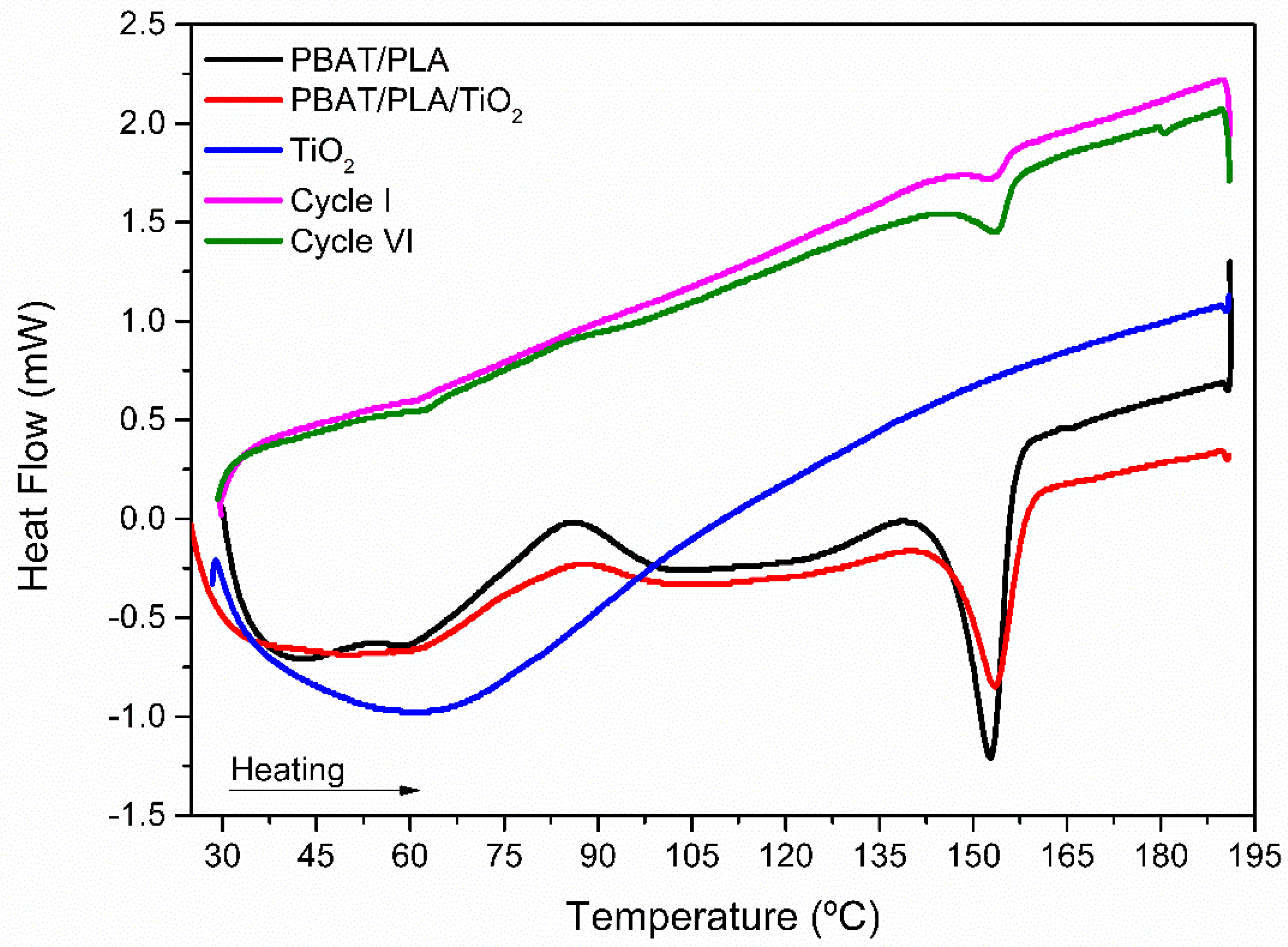 Figure 10. Heating thermograms (DSC) referring to the polymeric fibers of PBAT/PLA and PBAT/PLA/TiO2 before and after the first and sixth cycles of photocatalytic degradation of the dye Red BF-4B.