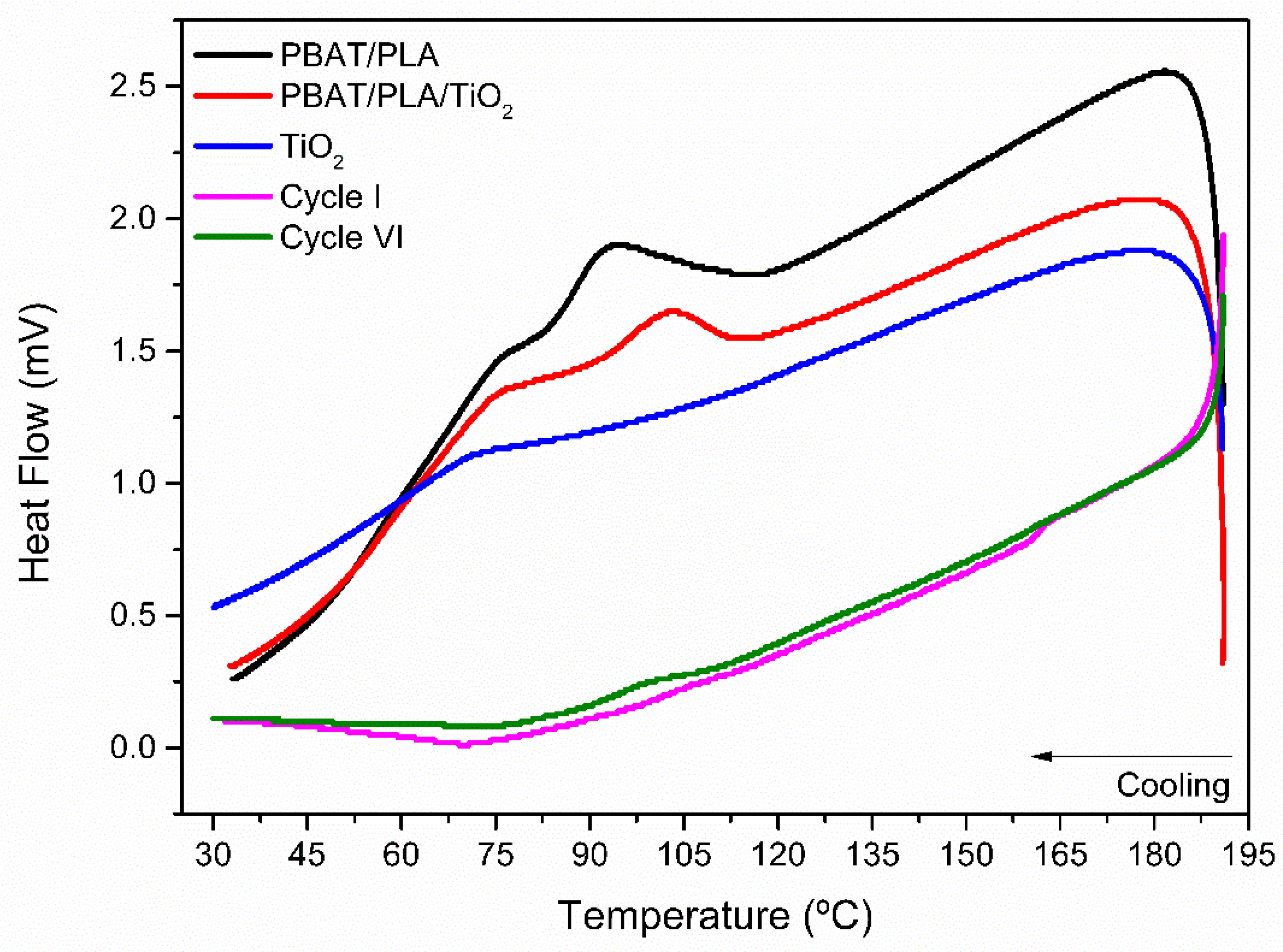 Figure 11. Cooling thermograms (DSC) referring to the polymeric fibers of PBAT/PLA and PBAT/PLA/TiO2 electrospun fibers before and after the 1st and 6th cycles of photocatalytic degradation of the dye Red BF-4B.