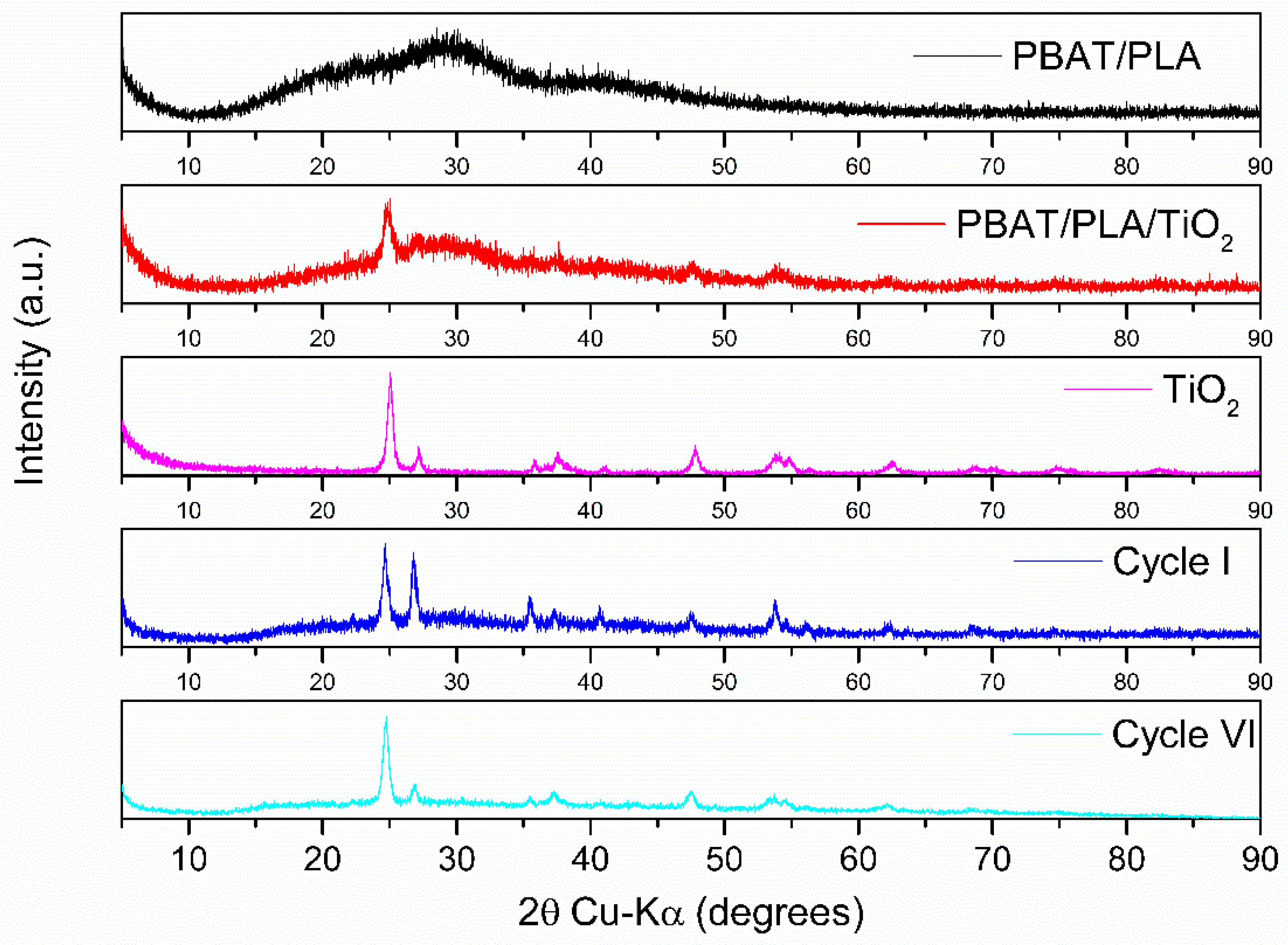 Figure 12. X-ray diffractograms of TiO2 NPs, polymeric fibers of PBAT/PLA, and PBAT/PLA/TiO2 before and after the 1st and 6th cycles of photodegradation of the Red BF-4B dye.