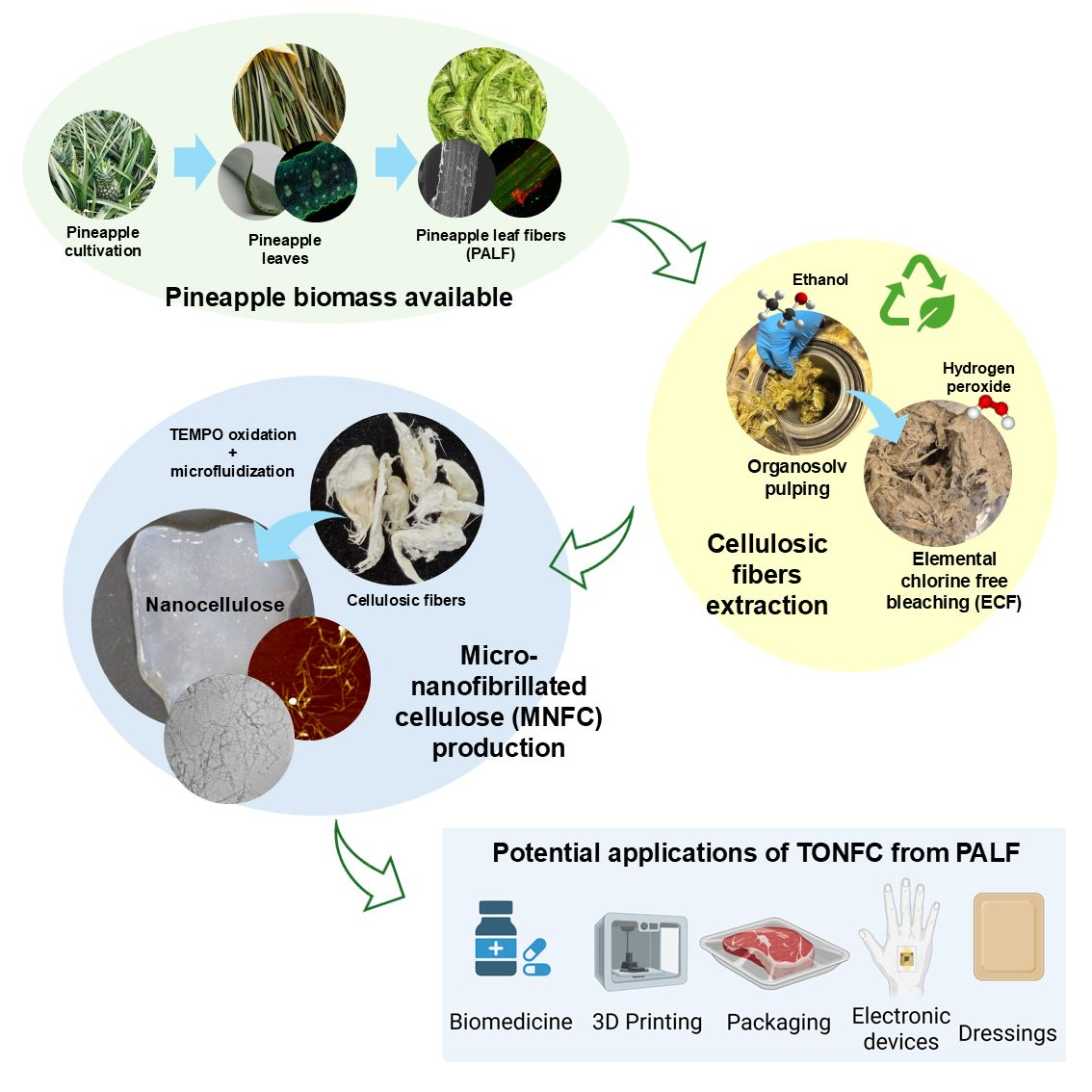 Hence, the present study proposes the production of micro-/nanofibrillated cellulose (MNFC). The nanomaterial is produced by applying a sequential ethanol-based process with optional hydrogen peroxide bleaching, followed by TEMPO oxidation and subsequent mechanical processing by microfluidization.