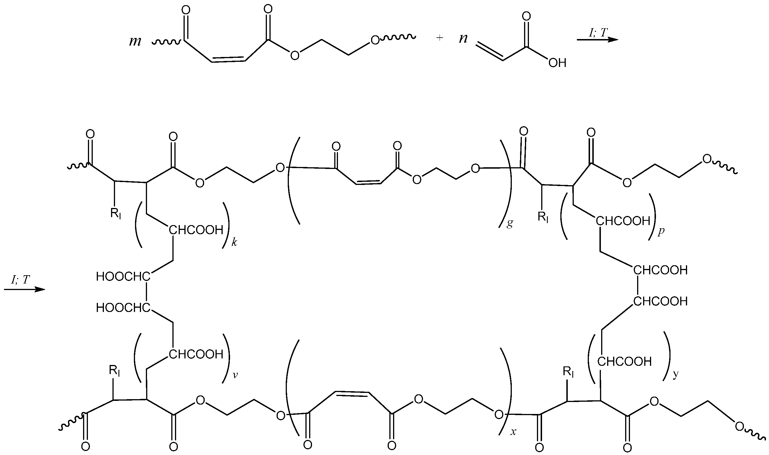 - Burkeev, M.; Zhunissova, M.; Tazhbayev, Y.; Fomin, V.; Sarsenbekova, A.; Burkeyeva, G.; Kazhmuratova, A.; Zhumagalieva, T.; Zhakupbekova, E.; Khamitova, T. Influence of RAFT Agent on the Mechanism of Copolymerization of Polypropylene Glycol Maleinate with Acrylic Acid. Polymers 2022, 14, 1884. [Google Scholar] [CrossRef]