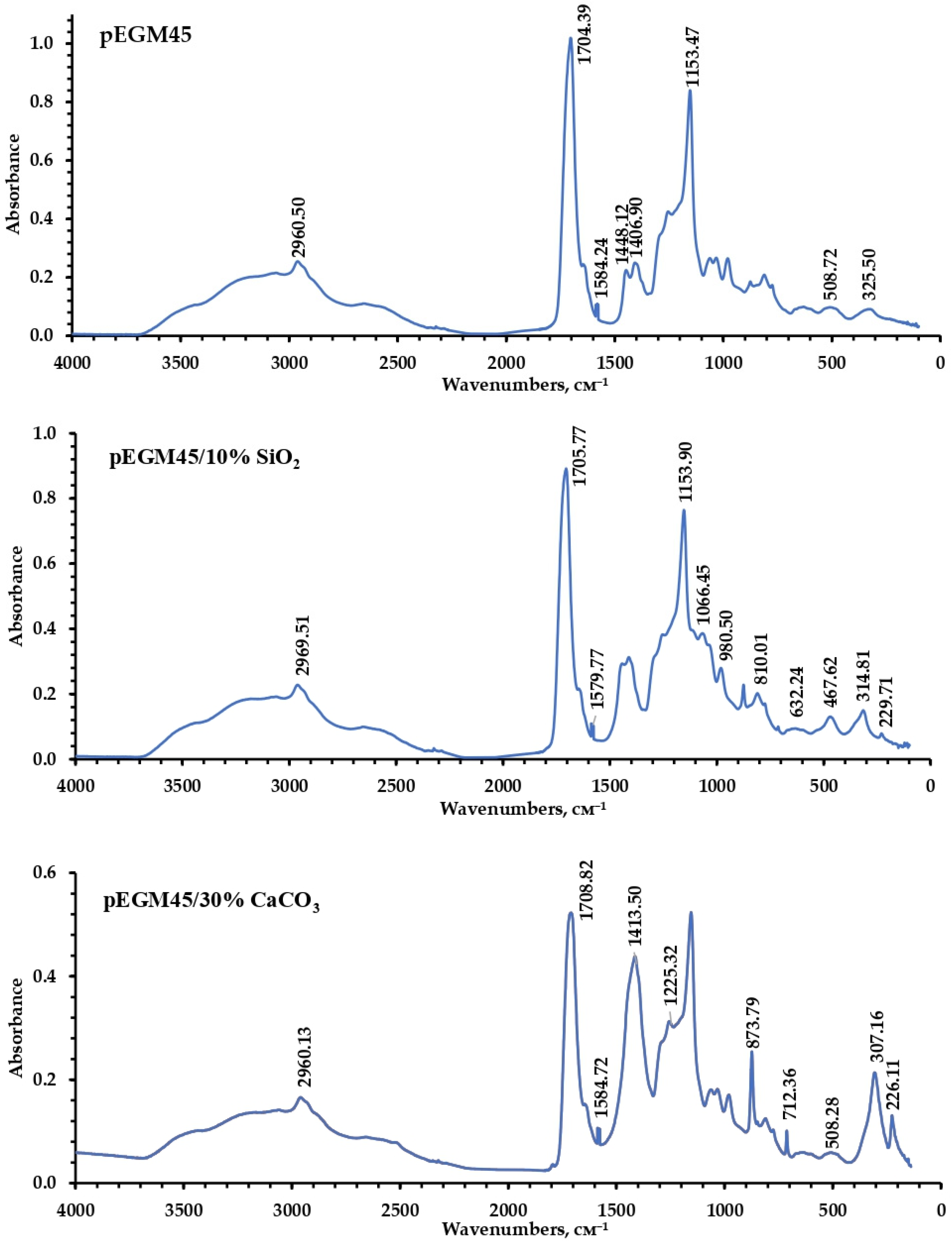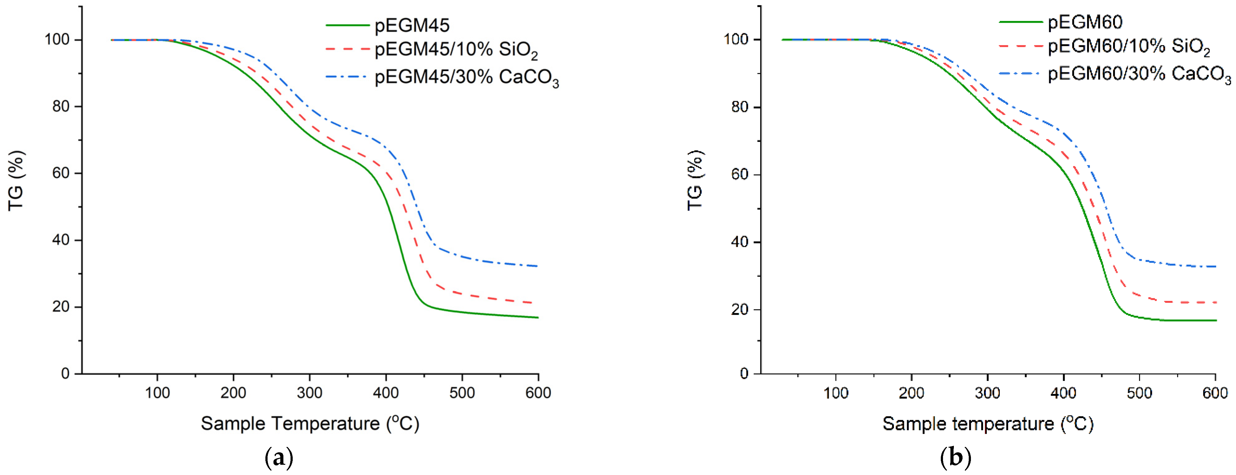 pEGM45/30% CaCO3 | 229.77 ± 5.16 | 50.44 ± 1.05 | 280.21 ± 6.16 | 0.82 | |