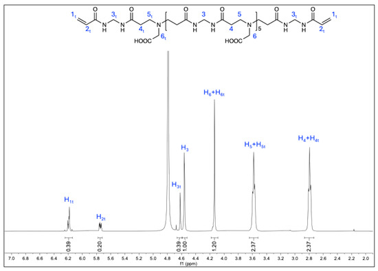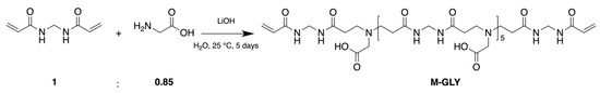 An M-GLY polyamidoamine oligomer bearing acrylamide terminals was synthesized through the aza-Michael polyaddition of N,N′-methylenebisacrylamide (MBA) with glycine in a 1:0.85 molar ratio (Scheme 1). One well-established way to tune the degree of polymerization of oligomers is indeed by adjusting the non-stoichiometric ratio between the complementary A and B groups of A-A/B-B monomers [38]. The reaction was conducted under standard experimental conditions, that is, 38 wt% concentration, pH 11, and room temperature [22]. The structure of the M-GLY oligomer was confirmed using 1H-NMR spectrometry (Figure 1), showing agreement with the expected molecular structure. The number-average molecular masses (Table 1) were consistent with theoretical values.