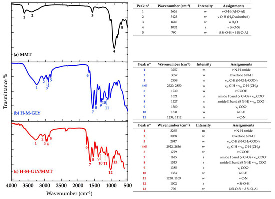 FT-IR/ATR spectra of MMT (a), H-M-GLY (b) and H-M-GLY/MMT (c).