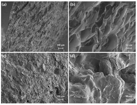 FE-SEM micrographs of H-M-GLY (a,b) and H-M-GLY/MMT (c,d) samples. Magnifications: 250× (a,c) and 2500× (b,d).