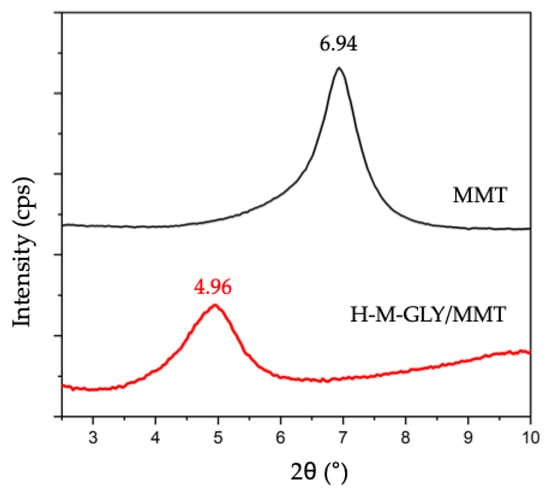 The occurrence of these strong interactions was confirmed by X-ray diffraction (XRD) spectroscopy. The XRD spectra of an M-GLY/MMT complex prepared by mixing the two components in water in a 1:10 weight ratio (Figure 5) showed that the characteristic 001 diffraction peak of MMT at 2Θ = 6.94° shifted to lower angles (4.96°) indicating an increase in the MMT interlamellar spacing from 1.27 nm to 1.78, thus confirming the formation of an intercalated system [39].
