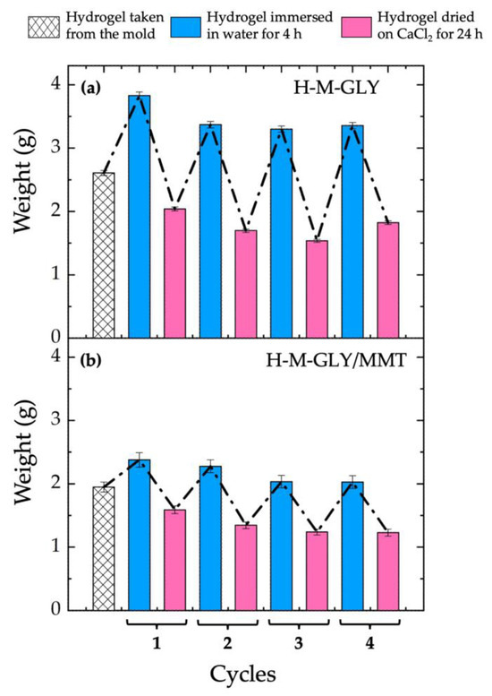 Water uptake of H-M-GLY (a) and H-M-GLY/MMT (b) hydrogels. Gray bar: sample just extracted from the mold; blue bars: water swollen samples; pink bars: dry sample. Data are the average of five experiments: standard deviation 3%.