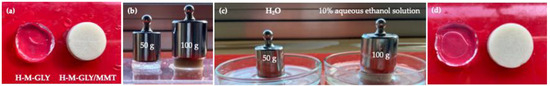 Pictures of H-M-GLY and H-M-GLY/MMT hydrogels: (a) before test, (b) under instantaneous stress, (c) under 1 h stress in water for H-M-GLY and 10% aqueous ethanol solution for H-M-GLY/MMT, and (d) after the compression test.