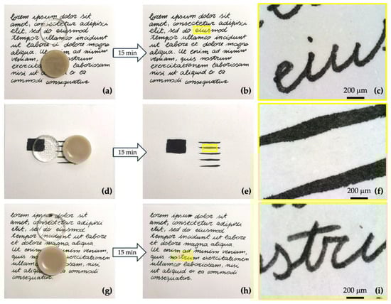 In this study, the compatibility between both H-M-GLY and H-M-GLY/MMT hydrogels and written paper was assessed by evaluating ink bleeding after extended hydrogel/paper contact and gentle rubbing. Bleeding tests were performed on marked paper using various combinations of paper types and inks. The objective was to verify that the hydrogels do not interact with two historically significant inks commonly found in manuscript conservation: India ink, used from around 400 AD to the present, and iron gall ink, prevalent from the Middle Ages to the 20th century. Application methods were chosen to reflect historical practices: India ink was applied in solid areas with a brush, mimicking woodblock print techniques (e.g., Japanese ukiyo-e), while iron gall ink was applied with a dip pen to simulate handwriting. No ink bleeding was observed in any of the tested paper samples following application of the hydrogel disks, indicating their compatibility with all tested ink and paper types. This is particularly evident from the analyses shown in Figure 8, which include also images obtained with an optical microscope (Figure 8c,f,i), revealing structural details of the inked paper sheets. Notably, no ink residues were detected on the hydrogel surfaces (Figure 9).