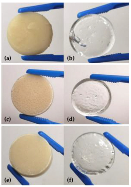 Hydrogel samples after contact with: FAVINI Canvas paper with iron gall ink ((a) H-M-GLY/MMT; (b) H-M-GLY); FAVINI Canvas paper with India ink ((c) H-M-GLY/MMT; (d) H-M-GLY); Fabriano Smooth paper with iron gall ink ((e): H-M-GLY/MMT; (f) H-M-GLY).