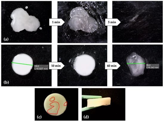 Wax cleaning tests were carried out using H-M-GLY/MMT hydrogels fully swollen with a 5% aqueous ethanol solution. Wax stains (45 mg) were deposited on the top of glass slides. As a control, the effect of pure ethanol on removing the wax layer from the glass slide was assessed by rubbing with an ethanol-infused cotton swab. Wax removal using pure ethanol (Figure 10a) required vigorous rubbing for totally 5 min, during which the cotton swab was wetted with ethanol three times. Ethanol partially dissolved, swelled and softened the wax layer, which was largely removed through mechanical action. In the same test, H-M-GLY/MMT hydrogels were applied three times providing a total of 30 min of gel–wax contact and used to gently rubbing. Under the adopted conditions, wax stains were partially removed from the glass, leaving on average 13% residual wax—with a 5% uncertainty (Figure 10b). Wax removal was confirmed by the presence of debris on the gel surface (Figure 10c). At the end of the test, the reinforced hydrogel remained intact, showing no cracks or signs of damage (Figure 10c,d), whereas the plain hydrogel, tested in control experiments, left 27% residue, fractured under the same stress conditions and was not further considered for this application.