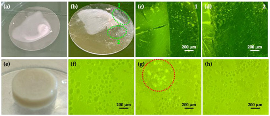 Both H-M-GLY and H-M-GLY/MMT hydrogels were typically stored at 5 °C for several months in a 5% aqueous ethanol solution, which prevented microbial contamination and mold growth, leaving the hydrogels unaffected. Moreover, as noted in the Introduction, the M-GLY matrix is known for its high thermal and photo-oxidative stability. To assess hydrogel durability under working conditions, a second set of wax-cleaning tests was performed using H-M-GLY/MMT disks aged for two years. The initially dry samples were swollen to equilibrium in a 10% aqueous ethanol solution. The morphology of the aged hydrogels were intact and unchanged compared to freshly prepared samples after swelling. Wax stains (8 mg) were deposited on glass slides, and removal was achieved by gently rubbing using the composite hydrogel for 10 s, followed by cleaning its exposed surface with a cotton swab, then briefly washing in the ethanol solution. This procedure was repeated 8 times. During the experiment, the wax layer progressively faded under the mechanical action exerted by the reinforced hydrogel (Figure 11), and debris was displaced toward the glass border. After each pass, the hydrogel surface was soaked in the 10% aqueous ethanol solution and then gently rubbed to remove residues. Despite repeated treatments, the hydrogel surface remained unaltered throughout the experiment (compare Figure 11f with Figure 11h).
