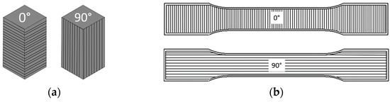 To best explore the effect of multiple print parameters on mechanical properties, a Design of Experiments (DoE) was created for both compression and tensile tests. Many different print parameters are known to influence the desired responses [30,31,32,33,34], including infill percentage, infill geometry, number of walls (shells), layer height, and orientation (load applied parallel or perpendicular to layers). The DoE enables experimental variation in multiple parameters while keeping a manageable number of required tests and is a strong tool utilized in other works where AM parameters are considered [30]. For the compression strength DoE, three parameters were selected at two levels: shells (1|3), infill percentage (50|100), and orientation of layer lines (0|90°). This angle was set relative to the direction of printing, so a 0° orientation has layer lines perpendicular to the direction of compression, and the 90° is in plane with the compression (see Figure 1a). Using a full factorial array, this resulted in eight batches of experimental variation where the sample order was randomized for testing. Batch numbers and their corresponding print parameters are given in Table 2. Although layer height can impact mechanical strength, specifically due to anisotropy, this parameter was fixed at a value of 0.2 mm. Infill geometry can be similarly impactful with variations ranging from simple grids to complex gyroid patterns. However, due to the challenges in quantifying this using a standard DoE, a constant honeycomb structure was utilized in this work. The impact of the infill pattern has been explored by other works, such as those from Birosz et al. [27] and Dudescu et al. [33]. By limiting the number of parameters assessed in this study, the experimental burden of a full factorial DoE was substantially decreased, while preserving statistical power and enhancing the reliability of the findings.