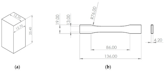 Test specimen dimensions, in mm. (a) Compression test specimen dimensions; (b) tensile test specimen dimensions.