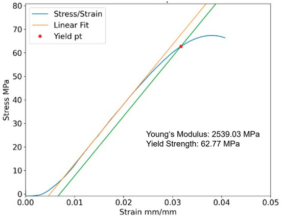 From the load, position, and dimensional data taken, stress–strain graphs were plotted. Stress is calculated by Equation (1), and strain is calculated by Equation (2). Individual plots were made, which include a calculation of yield strength and Young’s modulus based on the slope of the elastic region. A standard 0.002 strain offset line was used to calculate the yield point (see Figure 3). Excel was used to calculate the mean and standard deviation of yield, ultimate strength, and elastic modulus for each batch in PLA and BMD-PLA, shown in Table 4 and Table 5, respectively. Ultimate strength values for PLA are not reported as the loading would continue to increase even as the plastic began to squeeze outside of the compression surfaces.
