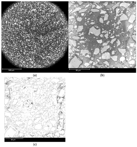 SEM microscopy of printed BMD-PLA sample. (a) 150× magnification; (b) 1000× magnification; (c) particle area fraction trace of 5b from ImageJ.
