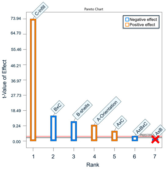 Design of Experiments results: compressive yield strength main effects. A = Orientation, B = Shells, C = Infill. The AxB interaction is crossed out as it was below the significance threshold.