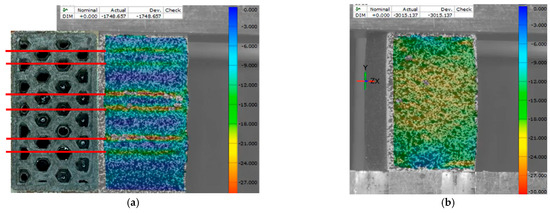 In Figure 7a, an image of the specimen cross-section is superimposed on the side of a still image of the strain map at just before maximum load. It shows the internal structure of the specimen which has 50% infill and 90° orientation, with red lines which extend the high strain regions. The lines of high strain fall along regions where the cross-section appears to contain more voids due to the honeycomb infill structure dictated.