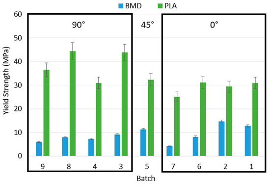 For this reason, the quality of the tensile response values for elastic modulus, yield, and ultimate strength are called into question. However, the discussion will still compare a limited set of acceptable BMD-PLA tensile samples with their PLA counterparts qualitatively. Comparing the overall behavior of the PLA and BMD-PLA tensile data corroborates the relationship between pure matrix and composite that was noted in compression. A graph of PLA and BMD tensile yield strengths is given in Figure 9, organized from 0° infill to 90° infill.