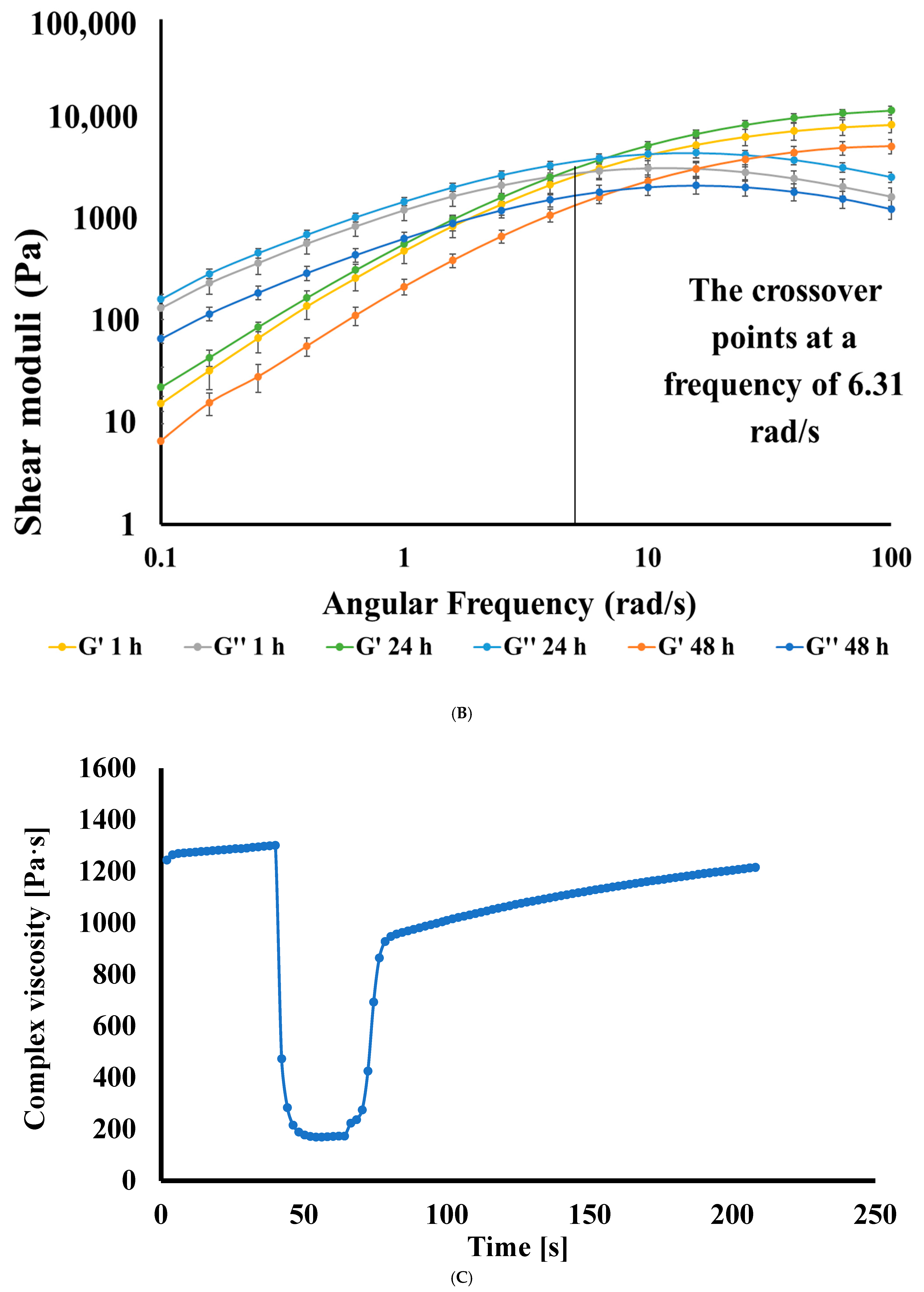 Time of Crosslinking (h) | LVR (%) | Applied Strain Within the LVR (%) | Critical Strain (γC, %) |