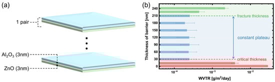 ALD nano-stratified Al2O3/ZnO barrier. (a) Schematic illustration of alternating Al2O3/ZnO sublayers. (b) WVTR as a function of barrier thickness, indicating the critical thickness, the plateau regime, and fracture thickness.