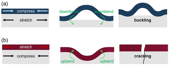 Schematic illustrations of failure mechanisms in thin films under different residual stress states. (a) Compressive residual stress induces buckling. (b) Tensile residual stress leads to cracking.