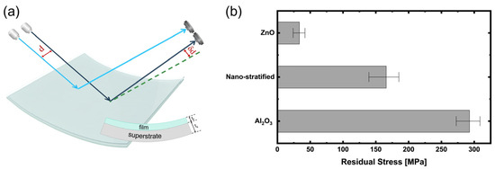 Residual stress in ALD-based barrier films. (a) Schematic illustration of residual stress measurement using a laser scanning method. (b) Residual stress comparison among single-layer Al2O3, single-layer ZnO, and nano-stratified (Al2O3/ZnO) structures.