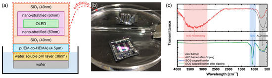 Device structure and FT-IR analysis. (a) Schematic of the OLED device and exfoliation process. (b) Photograph of water-assisted exfoliation process. (c) FT-IR spectra of ALD barrier and SiO2-capped barrier films before and after water dipping.