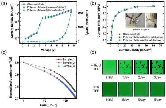 Electrical and optical performance of OLEDs on different platforms. (a) Current density–voltage–luminance (J–V–L) characteristics of OLEDs on a glass substrate, a polymer platform before exfoliation, and a polymer platform after exfoliation. (b) Current efficiency–current density curves of OLEDs on the same platforms. (c) Operation lifetime under constant-current driving, showing normalized luminance over time. (d) Photographs of OLEDs on the polymer platform and emission images with and without TFE over 20 days.