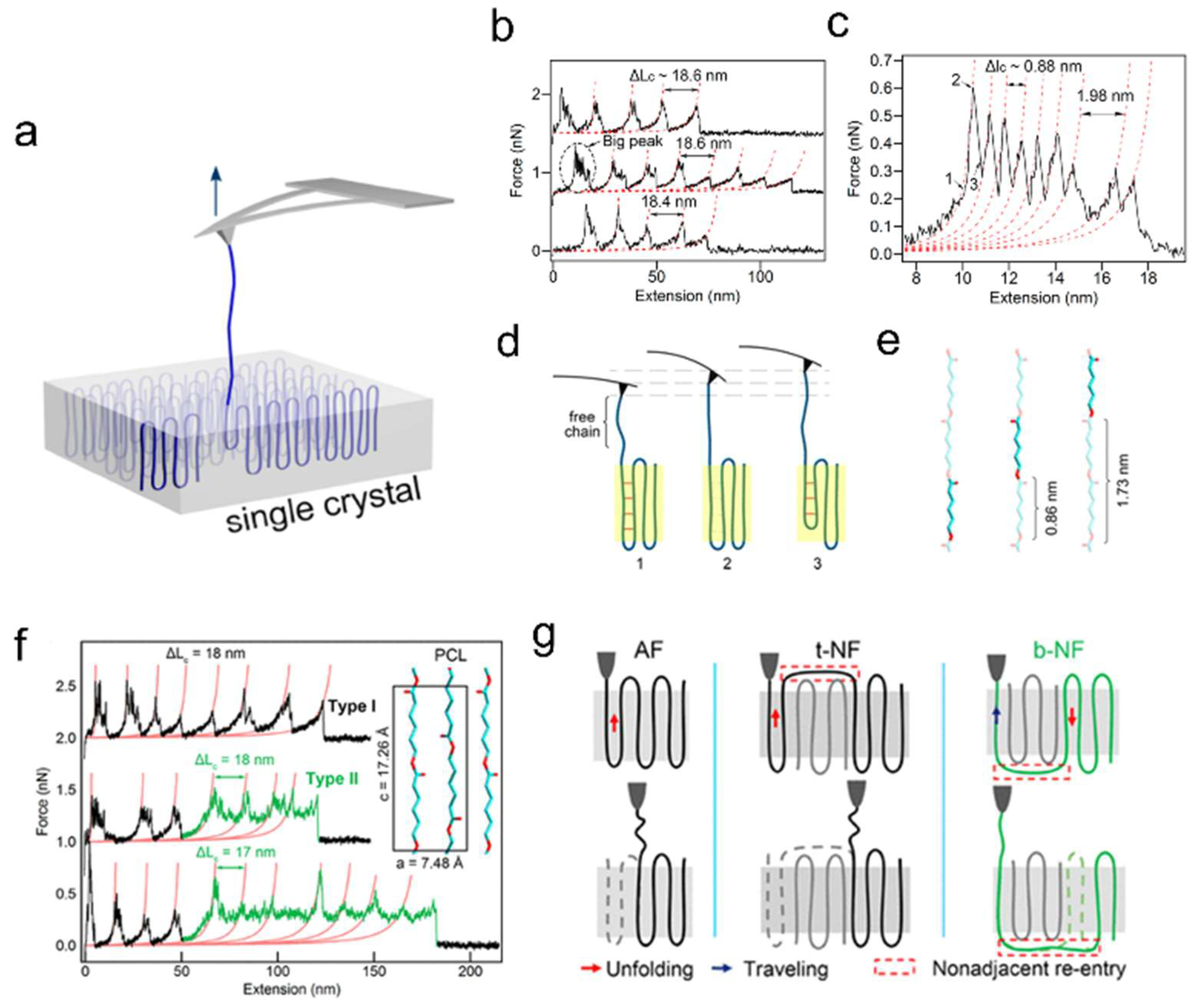 - Ma, Z.; Yang, P.; Zhang, X.; Jiang, K.; Song, Y.; Zhang, W. Quantifying the Chain Folding in Polymer Single Crystals by Single-Molecule Force Spectroscopy. ACS Macro Lett. 2019, 8, 1194–1199. [Google Scholar] [CrossRef]